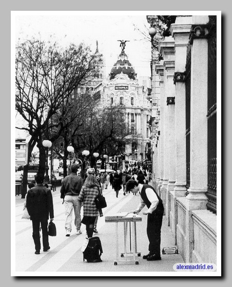 Un músico callejero toca el xilófono en la calle Alcalá.