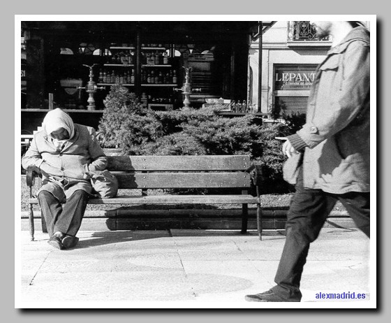 Un viandante mira a un hombre dormitar en un banco del paseo de Recoletos.