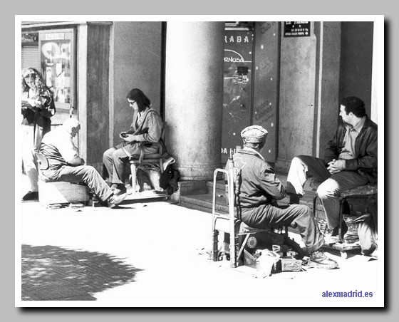 Una mujer paga al limpiabotas en el portal del Palacio de la Prensa.