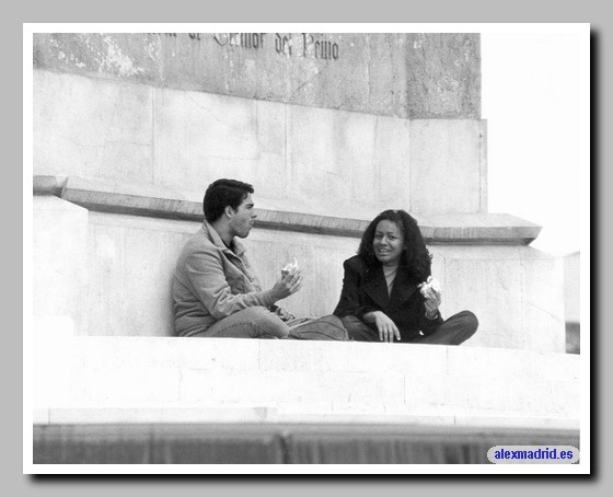 Una pareja toma el bocadillo bajo el monumento a Cristóbal Colón.
