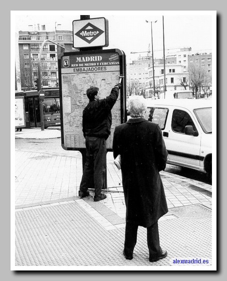 Un operario limpia un panel publicitario en la glorieta de Embajadores.