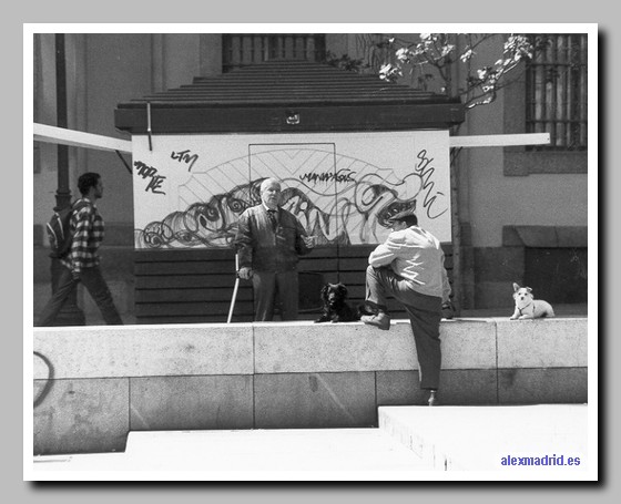 Dos hombres con sus perros charlan al lado del museo Reina Sofía.