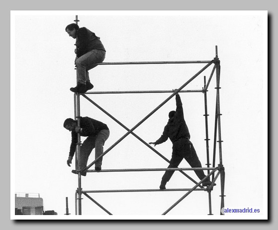 These three workers mount a metalllic structure at Felipe II avenue. One of them talked by phone for a while up there.