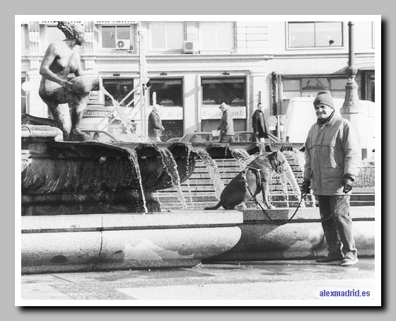 Un hombre parece posar orgulloso con su perro en la fuente de la Plaza de España.