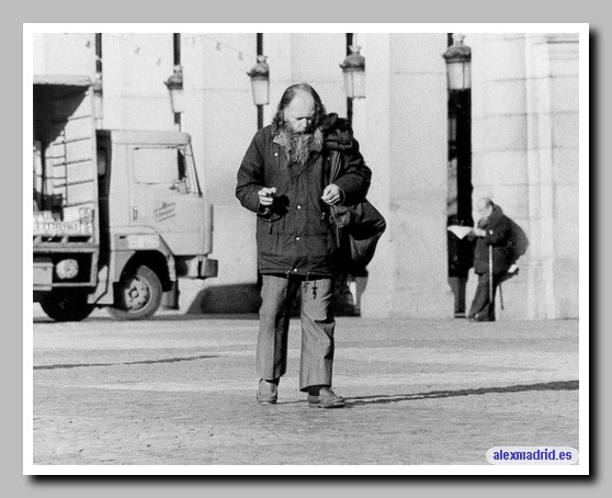 Un hombre camina por la Plaza Mayor hablando consigo mismo y haciendo signos con la mano.