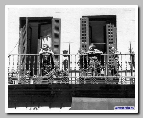 Dos abuelas charlan desde sus balcones en la calle Mayor.