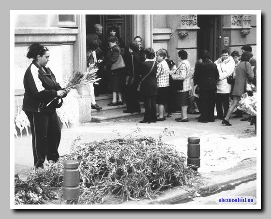 queue wait to kiss the foot of a Jesús de Medinacelli statue. The gipsy woman makes bunches with olive tree and rosemary branches.