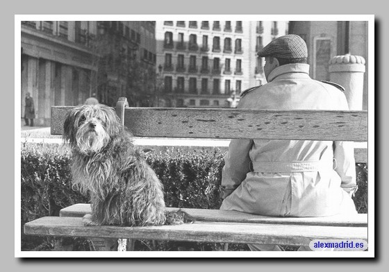 Un hombre y su perro pasan el rato sentados en un banco de la plaza de Oriente, al lado del Palacio Real.