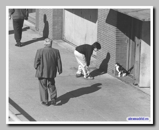 Un niño intenta tocar un gato afuera de la estación de Atocha.