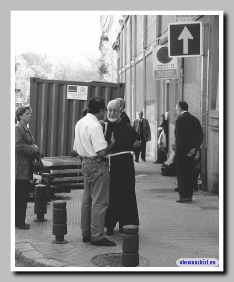 Un monje de la iglesia de Jesús de Medinacelli habla con un conocido.