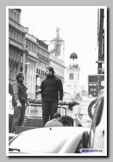 Dos obreros hablan mientras descargan material para la reforma de un edificio en la calle Alcalá.