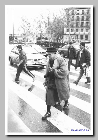 zany clothes walks through a pedestrian cross at Prado avenue.