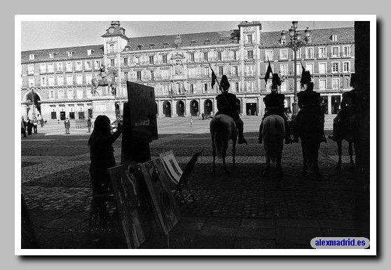 Una pintora de la PLaza Mayor sigue pintando con el desfile de caballos a pocos metros detrás de ella.