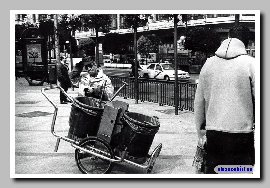 Un barrendero parece saludar a la cámara en la Gran Vía.