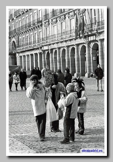 Dos madres y sus hijos van de compras por el mercadillo navideño de la Plaza Mayor.