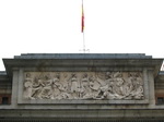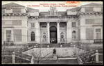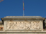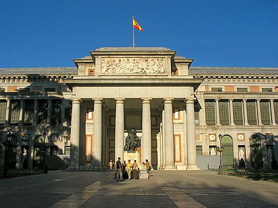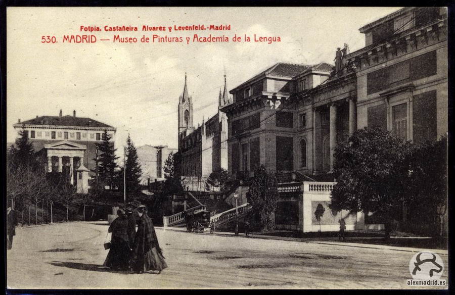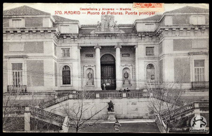 puerta principal del Museo de Pinturas. En la primera postal vemos al fondo la Academia de la Lengua y la iglesia de Los Jerónimos. En la postal siguiente encontramos la fachada del museo rematada por un